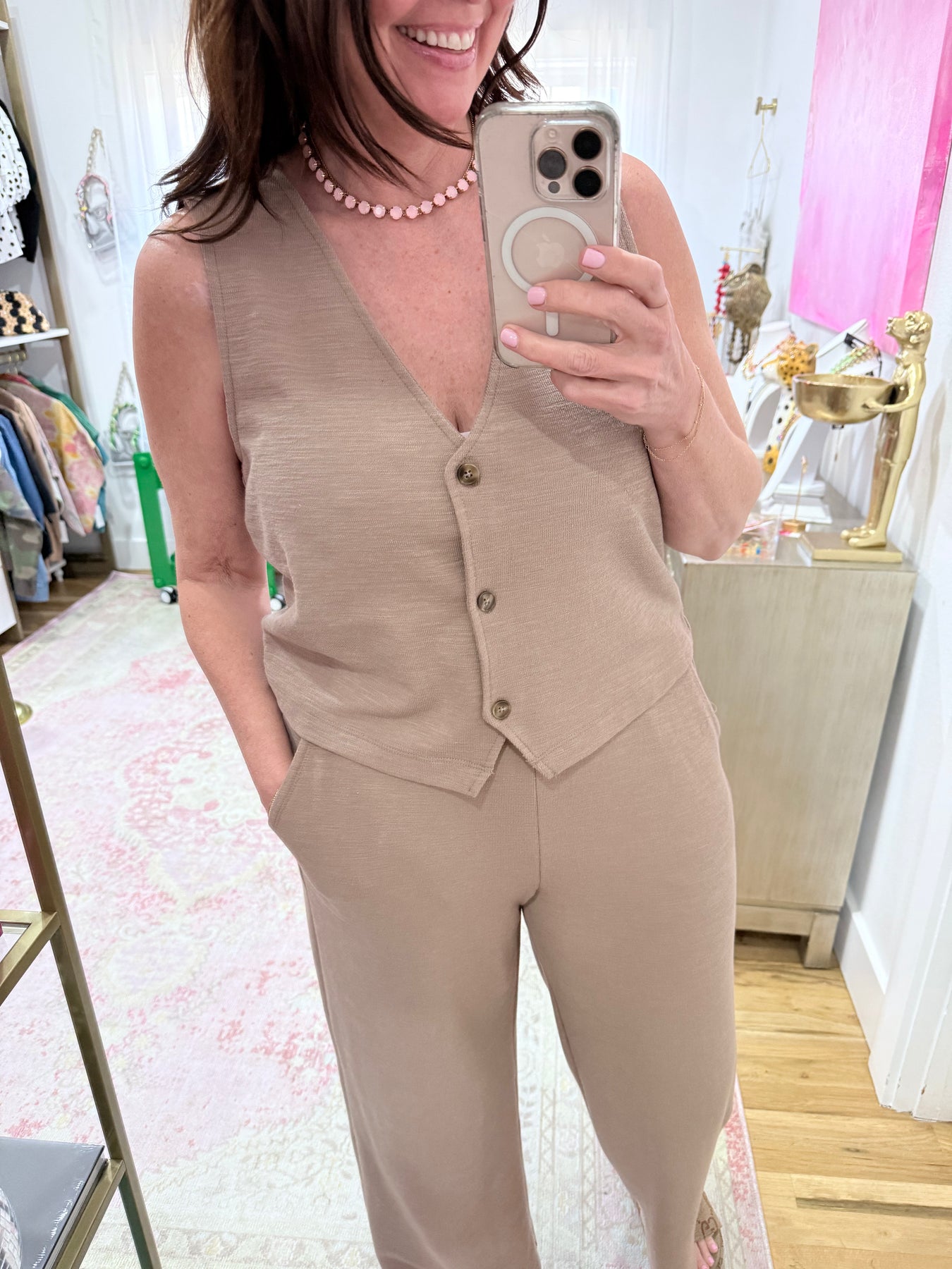 Detailed with a button front, v-neck, and lightweight textured knit fabric, this sleeveless top will be a forever staple in your wardrobe. Make it your go-to outfit with its matching ANDRE Pant or denim.